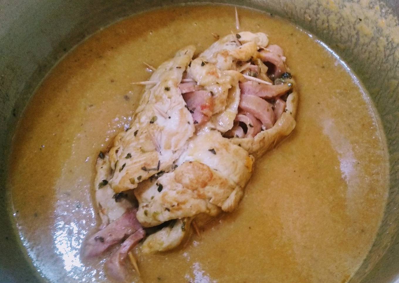 - Presentamos los filetes de pollo y añadimos la sal. Encima ponemos motas de queso crema (yo usé sin lactosa). Después las especias que queramos, en mi caso albahaca y tomillo, y encima los filetes de Sajonia. Atención, si no tenéis hilo (como fue mi caso) no es buena idea cortar los filetes de Sajonia. Envolvemos todo con cuidado y hacemos un rollito. Lo ideal es usar cordón, pero no tenía, así que usé palillos.