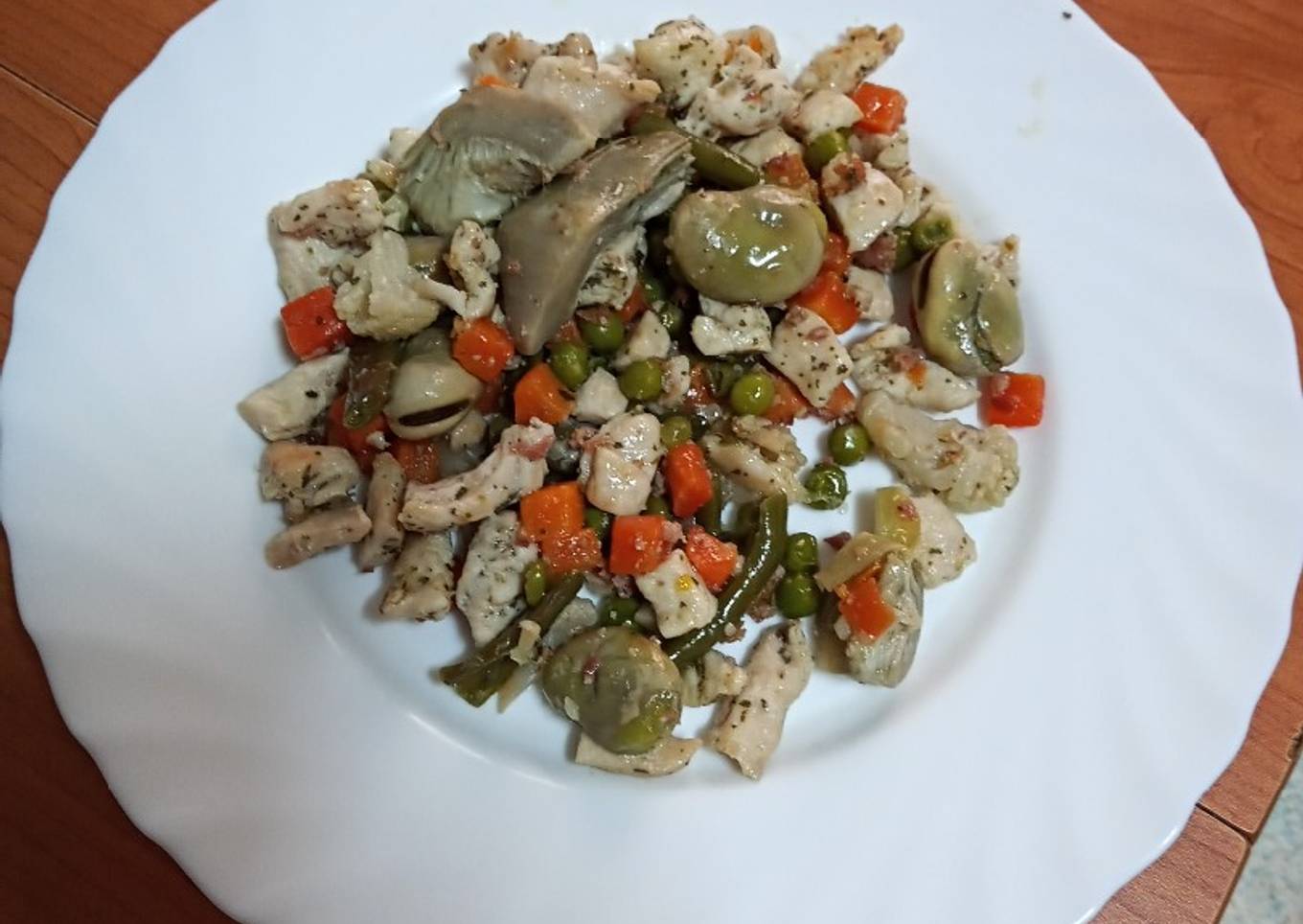Salteado de pollo con menestra de verduras