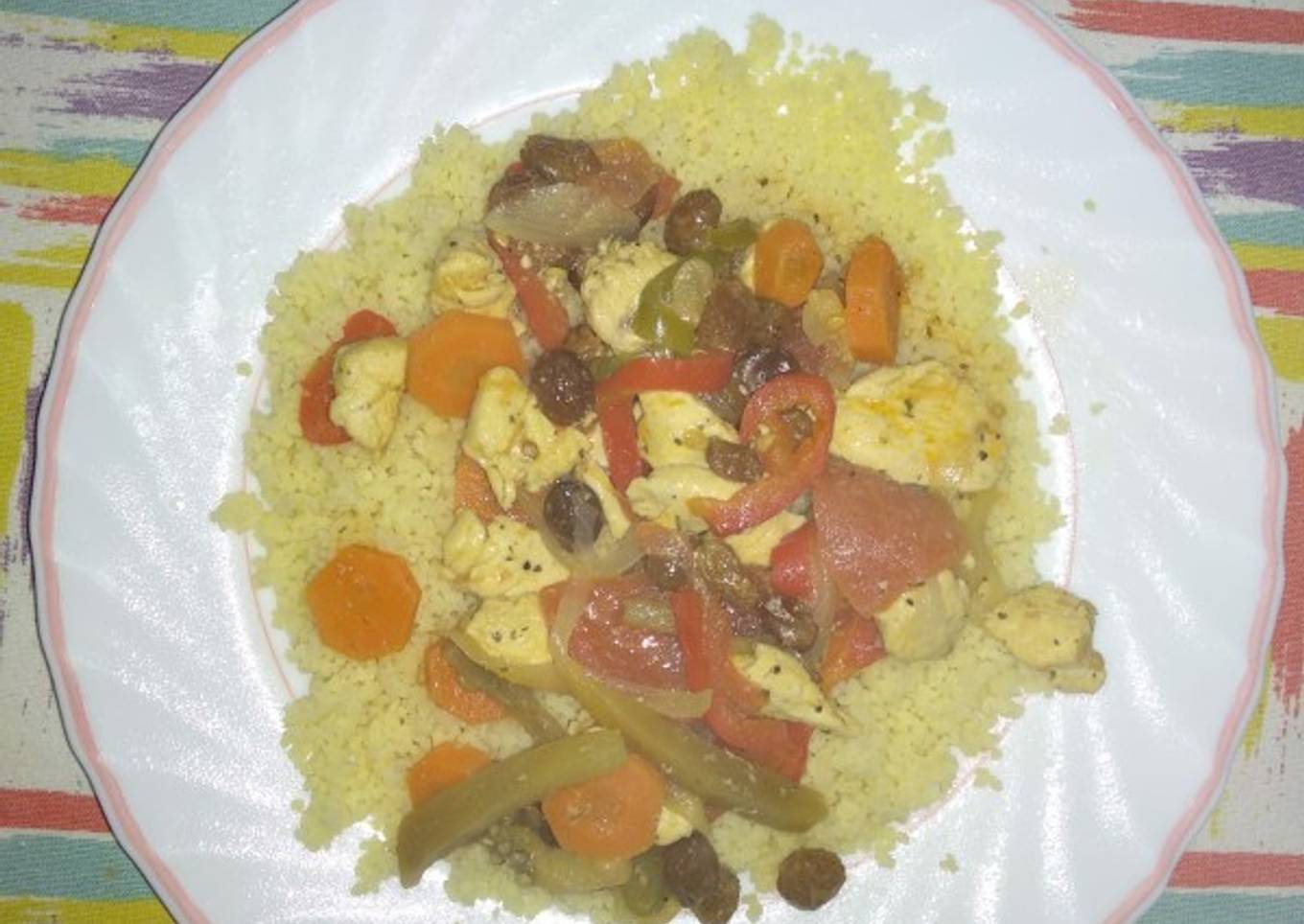 - Servir el cuscús con la mezcla de pollo y verduras por encima