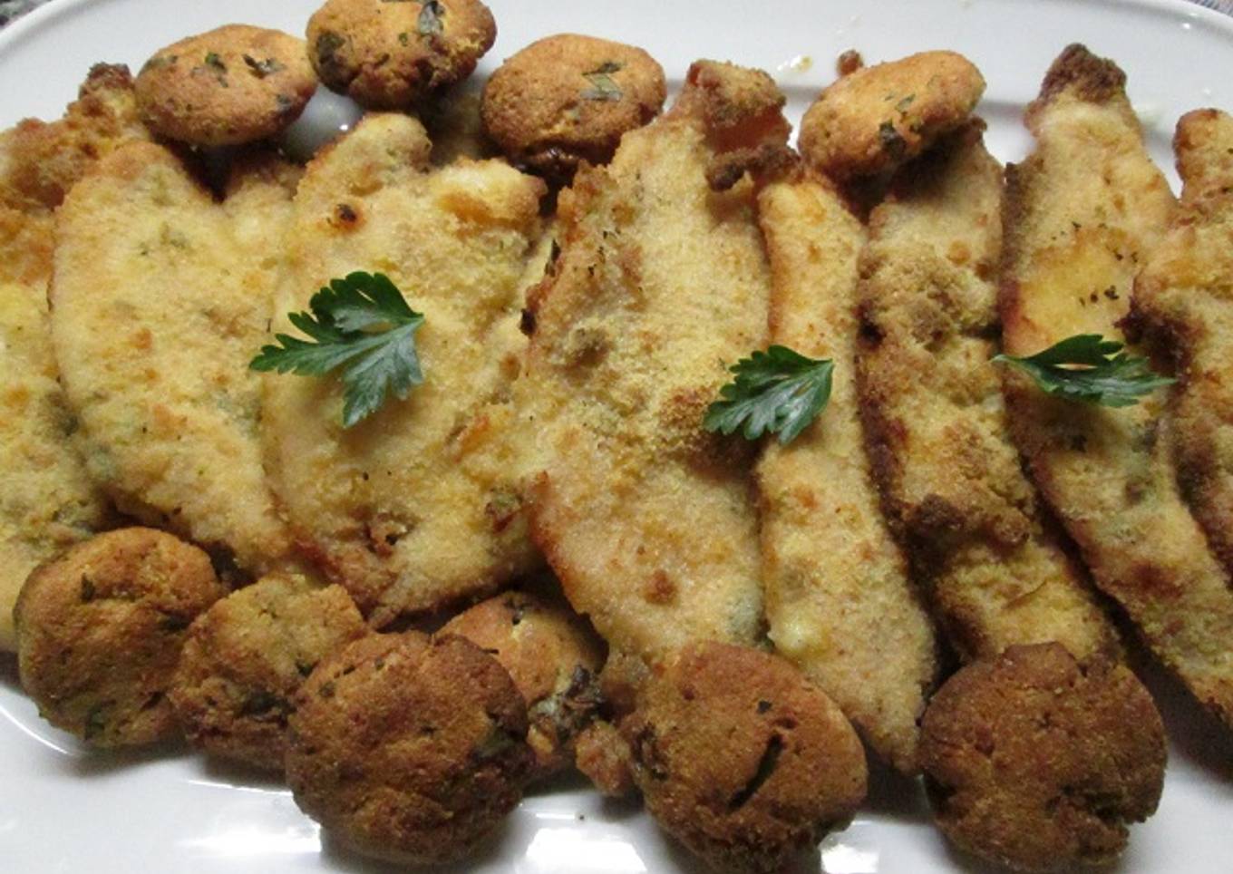 Milanesas de pollo adobadas y bolitas de pan horneadas