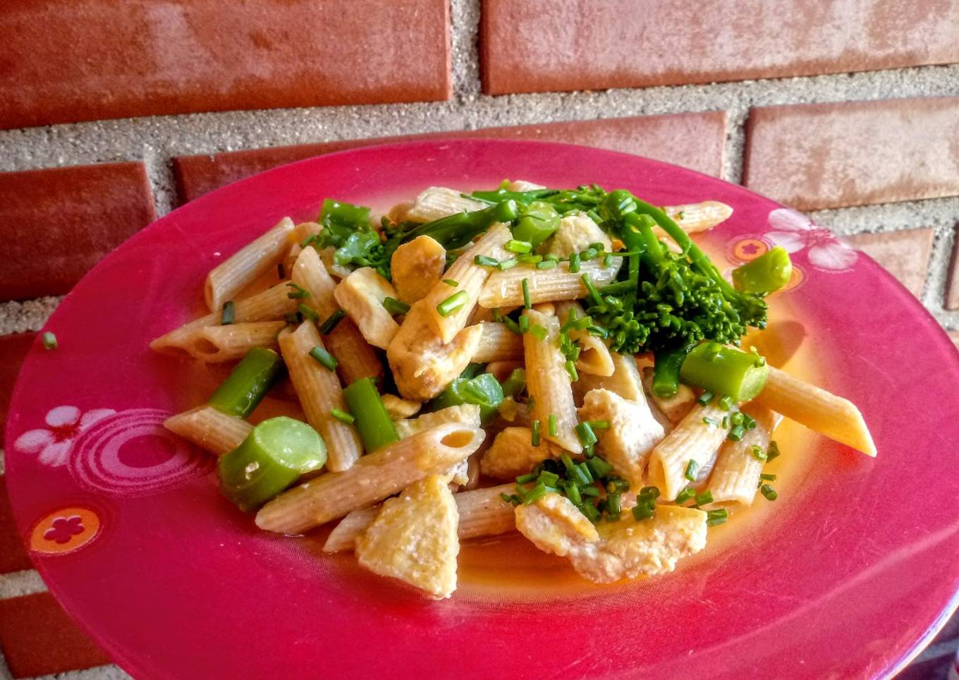 Macarrones integrales con bimi, pollo y piñones -sin tomate-