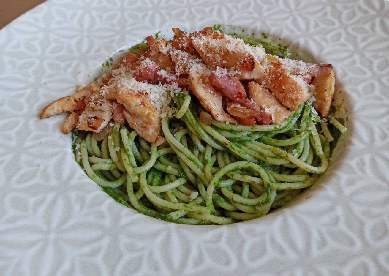 Pasta en salsa verde de espinaca con pollo, bacon y cebolla