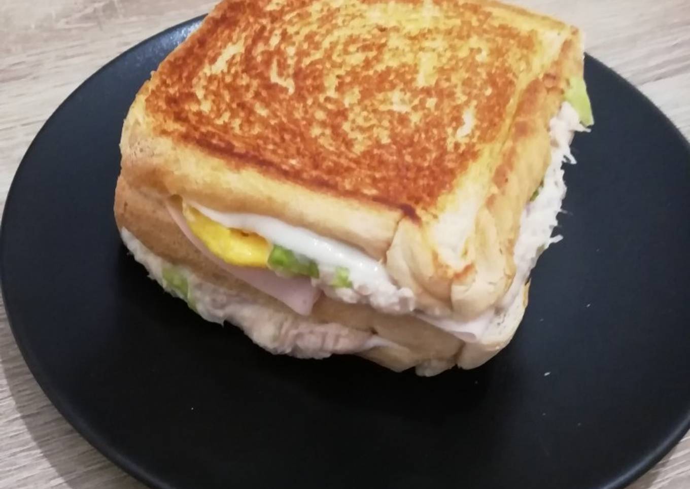 - Ahira hacemos los huevos a la plancha y los colocamos encima también. Le ponemoa de nuevp la mezcla del pollo y por último otra locha de queso de fundir, cerramos el sándwich.