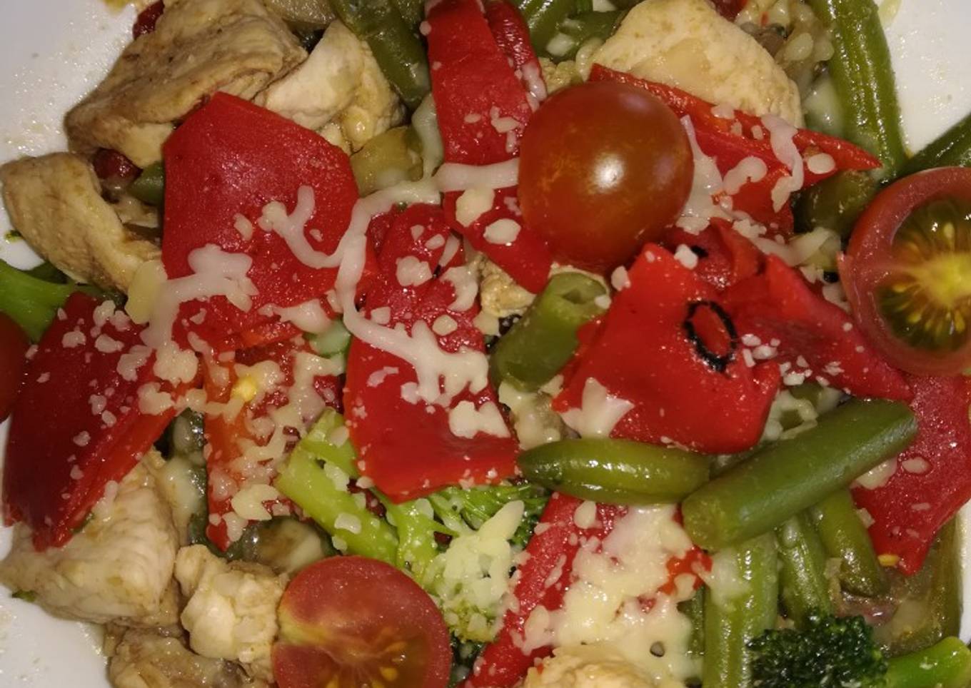 - Cuando esté retiramos del fuego y adornamos con queso rallado y tomates cherry