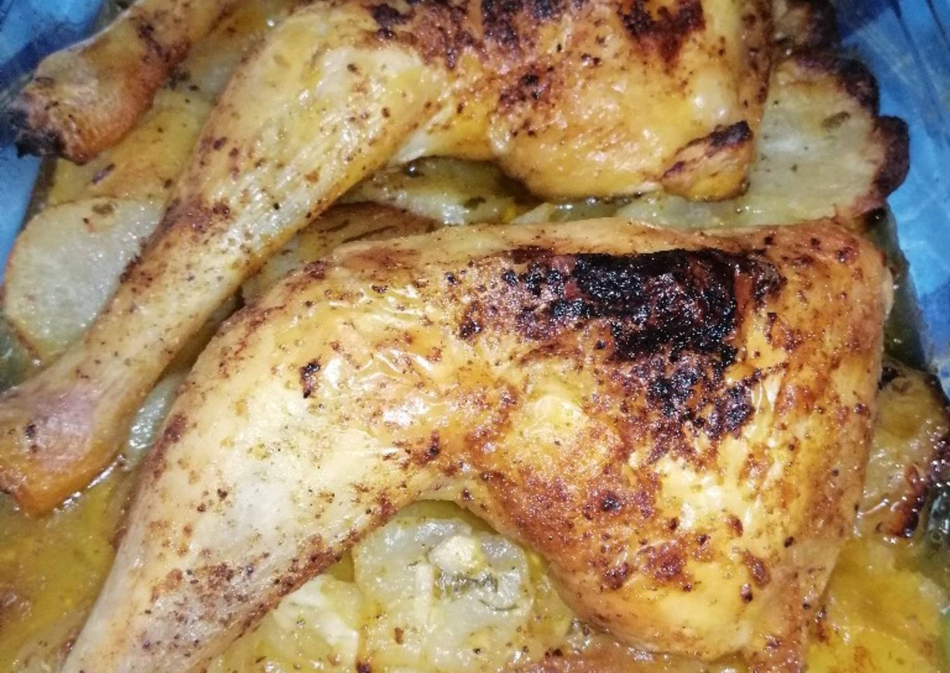 Después colocar las patatas en una fuente para el horno. - Yo suelo sellar el pollo friendolo un poco en la sartén, no es necesario que se haga, a continuación colocarlo sobre la cama de patatas y al horno, durante 40 o 50 minutos a 180ºC depende del horno. Y listo una delicia.