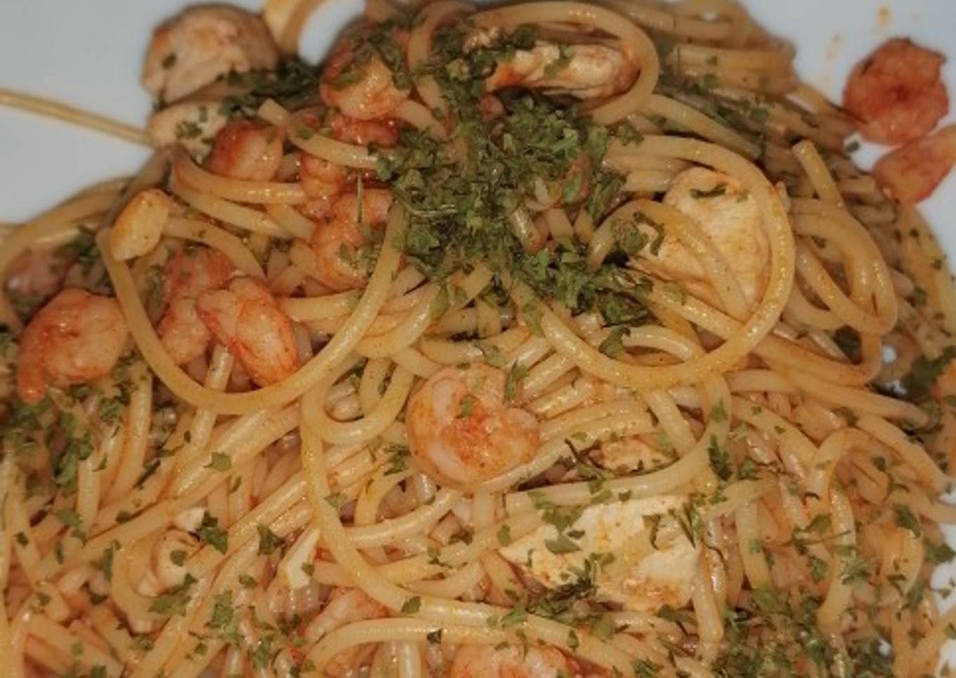 Spaguettis con pollo y gamba