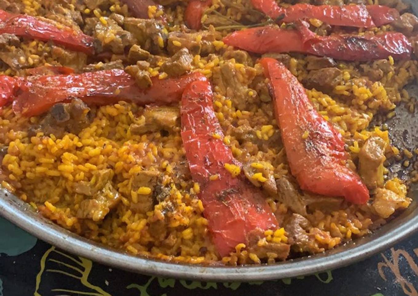- Dejamos hervir unos 10/15 min. Cogemos la paellera le añadimos un chorro de aceite de oliva y añadimos el arroz. Lo rehogamos un poco con el aceite sobre 1/2 min, que solo se empape de aceite con el fuego medio. Una vez pasados los 2 minutos y el arroz extendido por la paellera le añadimos el caldo de la sartén y ponemos los pimientos encima. Subimos el fuego unos 15 min y 5 min a fuego bajo. Una vez pasados los 20 min, apagar fuego y poner papel de aluminio encima para dejar reposar unos 5 min.