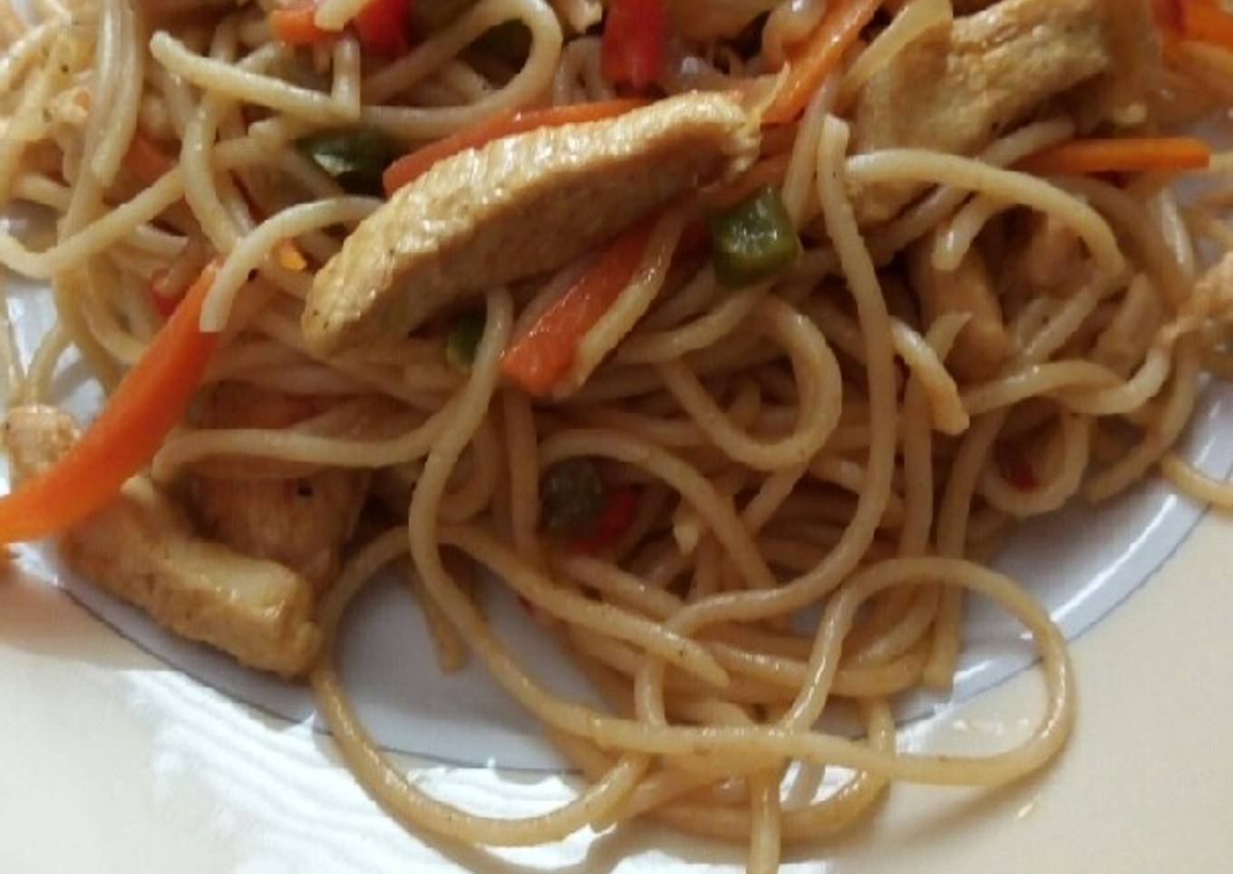 - Mientras cocemos los spaguettis. Escurrimos y añadimos al pollo. Removemos bien y dejamos cocinar un par de minutos que se integren bien los sabores.