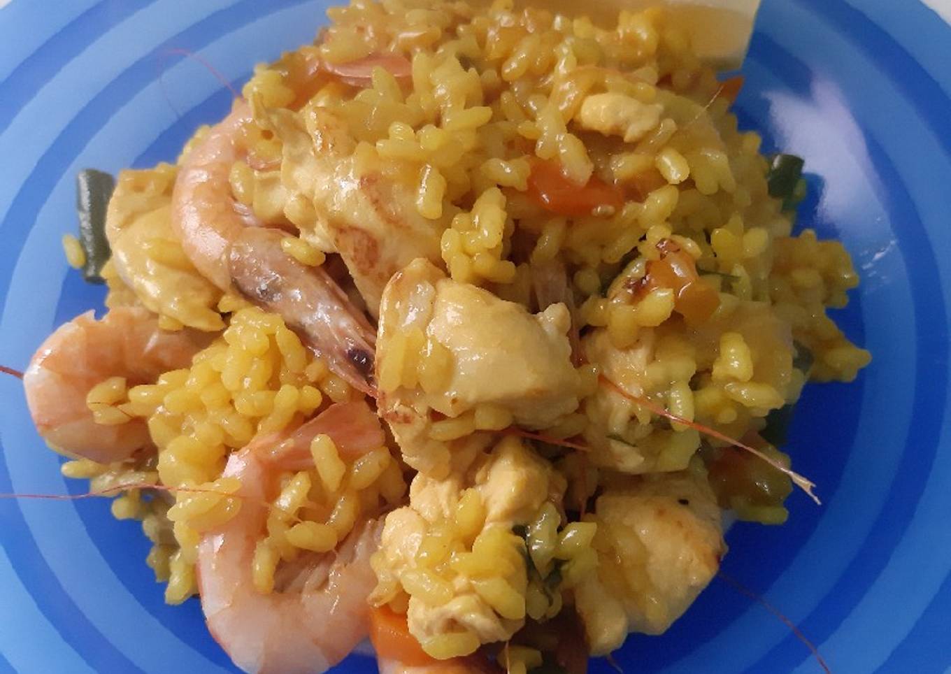 - Sofreímos la verdura y el pollo y le añadimos el arroz y le damos un par de vueltas