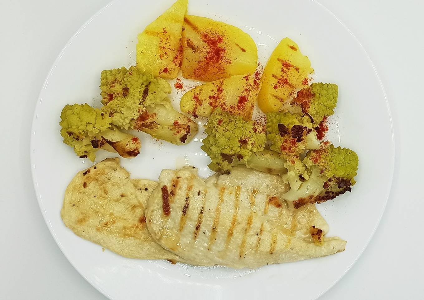 - Como ya he comentado cocimos el romanesco entero con patatas, nos sobró como la mitad y para el día siguiente no queríamos recalentar, así que encendimos la parrilla pintamos de aceite con un pincel de cocina las patatas el romanesco y las pechugas de pollo, las cocinamos a fuego fuerte de dos a tres minutos por cada lado. Empatamos, añadimos un poco de sal y de pimentón y listo.
