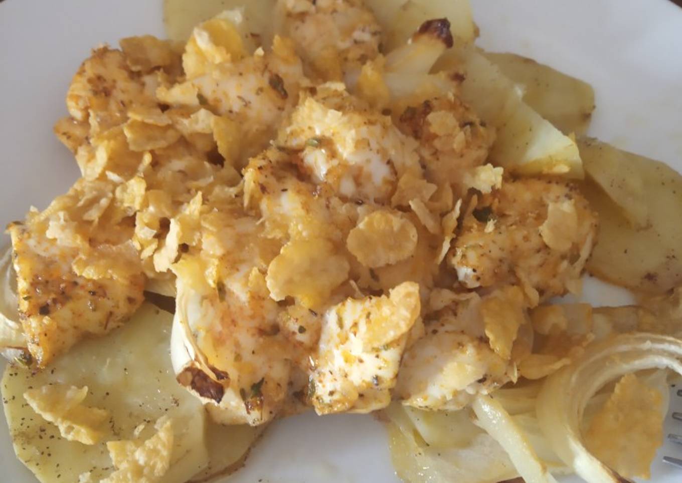 - OPCIONAL: Para darle un toque crujiente le he añadido unos cuantos copos de maíz triturados por encima al pollo, que al tener el aceite se le han pegado y se quedan crujientes al hornearlo todo junto.