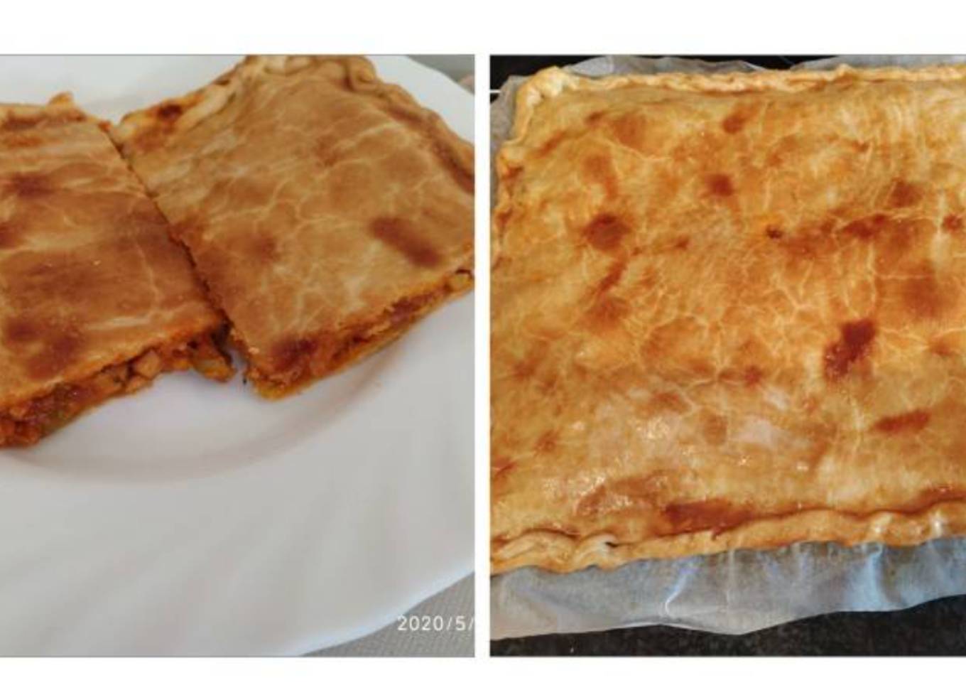 - Coger la bandeja del horno y extender una masa de hojaldre, ponerle encima toda la mezcla del pollo bien repartido, coger la otra masa y ponerla encima e ir cerrando los bordes