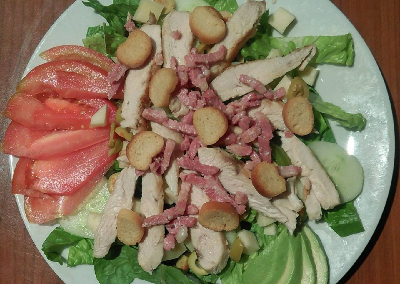 - En cada plato colocamos, lechuga, aguacate, tomate, pepino, rociamos por encima con los dados de queso, las tiras de pechuga, el bacon asado y los picatostes.