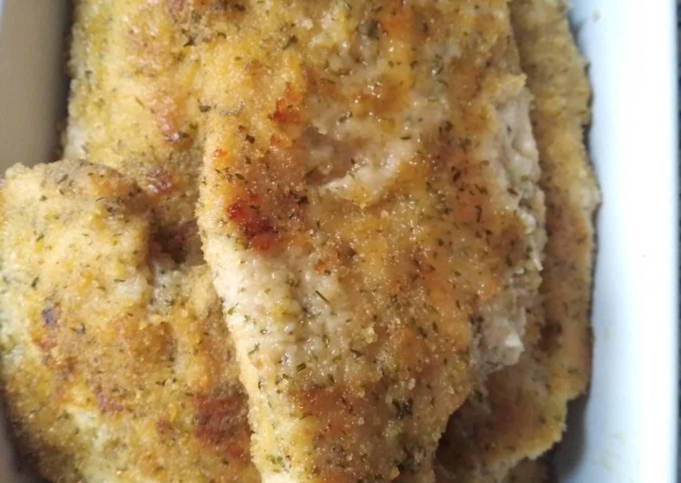 - Pasar por pan rallado con ajo y perejil cada filete y ponerlos en una asadera con una hoja de papel vegetal y un poquito de aceite de oliva