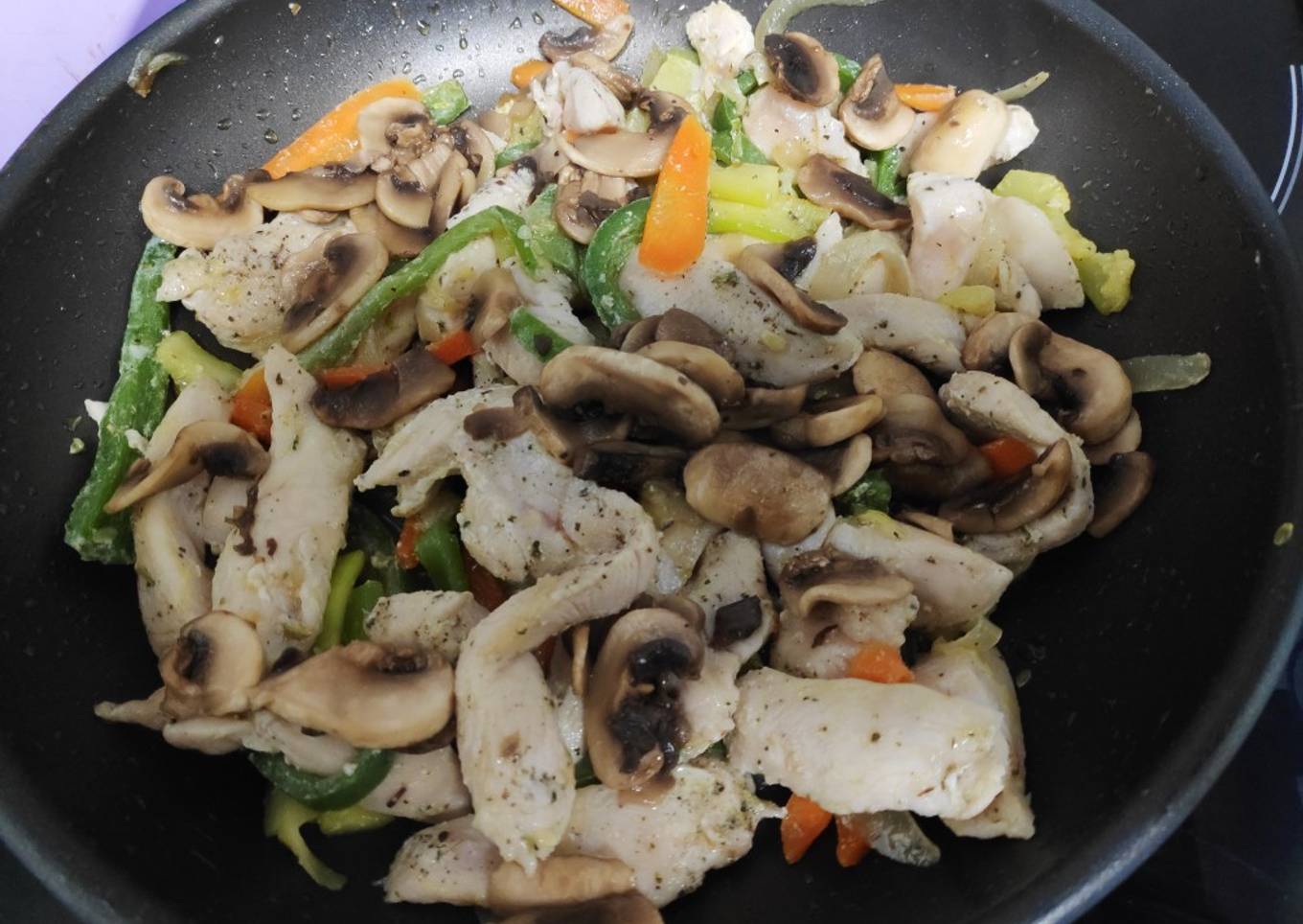 - Cuando las verduras estén casi al dente añadimos a la sartén el pollo a fuego fuerte para que se selle rápido y no eche agua.