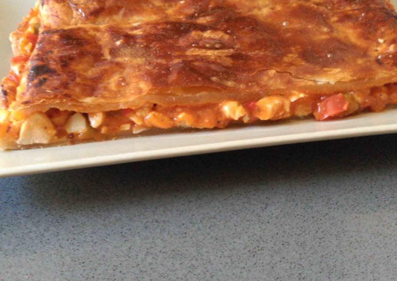 - Para casi finalizar, le añadimos los dos huevos duros picaditos y lo dejamos unos 10-15 minutos y seguir removiendo. Una vez listo, en una bandeja de horno ponemos la masa de hojaldre y rrellenamos con el pollo con verduras y tomate que ya está hecho anteriormente.Ahora tapamos con la otra masa de hojaldre y vamos juntando la masa base con la masa de arriba y rematamos los bordes con ayuda de un tenedor aplastando la masa.