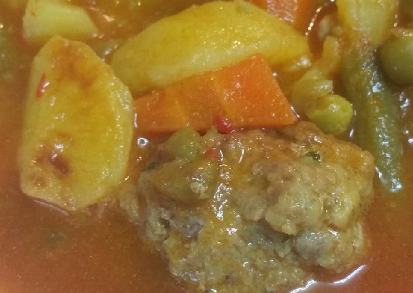 - Se meten las patatas con las zanahorias las judías verdes el avecrem la salsa de ostras el azafrán y el tomate frito se remueve bien se pone agua que lo cubra y cocemos media hora. Meter las albóndigas los guisantes cocer durante quince minutos más