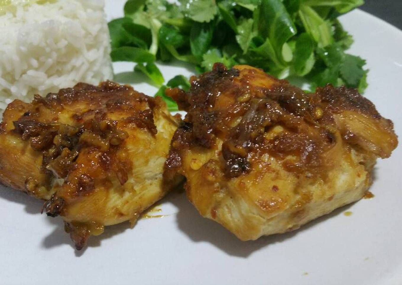 - Poner el pollo marinado en la bandeja de horno y introducir en el horno. Media hora a 200º para pechugas, 40 minutos a 140º para muslos y/o contramuslos. Abrir a medio tiempo para dar la vuelta y repartir la salsa.