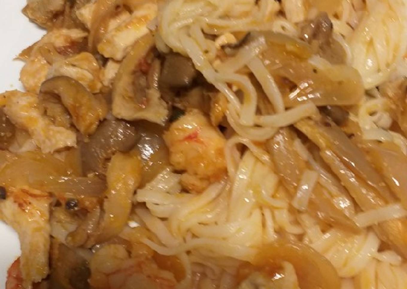 Tallarines de arroz, salteados con pollo, gambas y setas