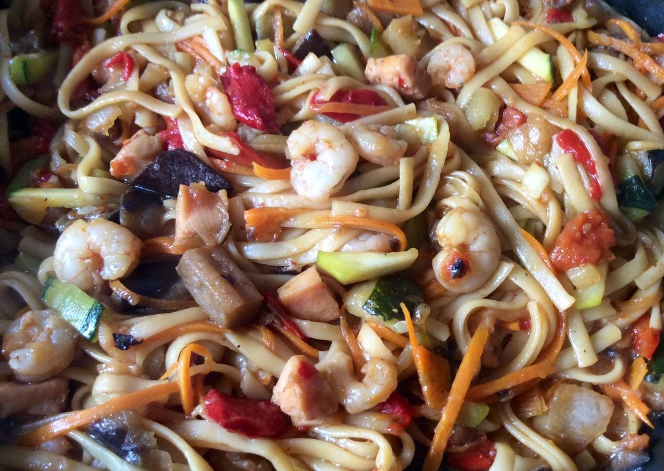 - Ahora tenemos que mezclar todos los ingredientes añadiendo la pasta, las gambas y las verduras a la cazuela. Agregamos la salsa de soja y la agridulce a nuestro gusto y no dejamos de remover hasta que se integren bien los ingredientes y se doren los tallarines hasta conseguir el tostado deseado. Podemos añadir unos copos de chile o cayena molida para obtener un resultado agripicante.