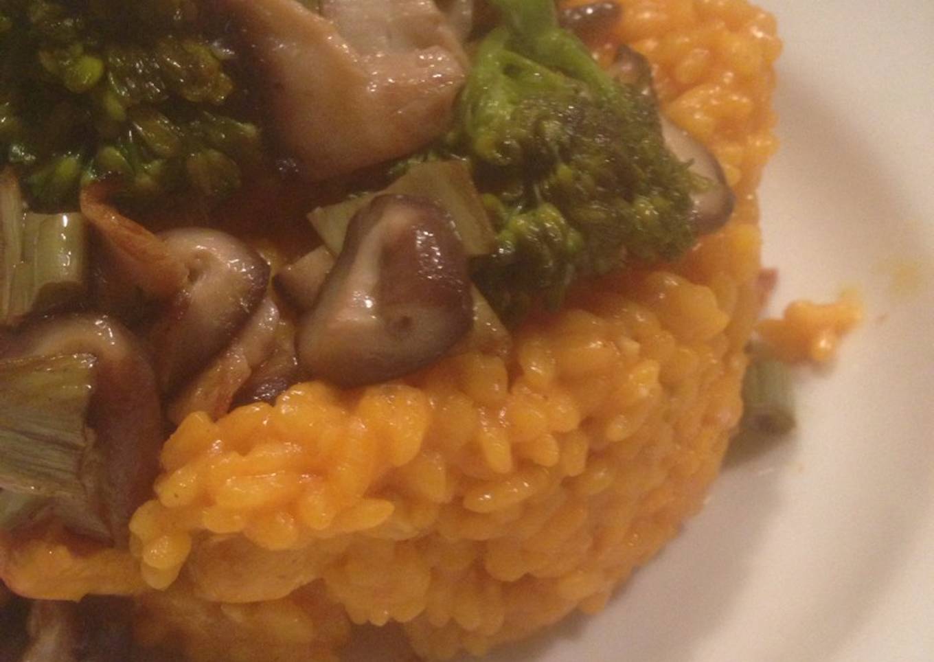 - Emplazamos primero el arroz y encima las setas, alcachofa y Bimi. Y a comer !!!